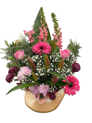 This Gorgeous pink design is arranged in a box featuring Roses, Snapdragons, Alstroemeria, Gerberas and Gypsophilia. Perfect for all occasions especially Birthdays, Mothers Day and Valentines Day and lovers of pink.