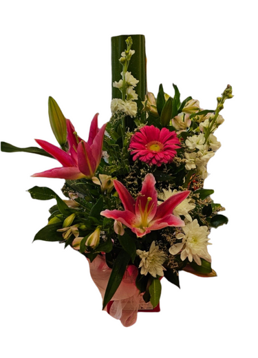 This Gorgeous arrangement is designed in a box featuring a variety of flowers including Lilies, Stocks, Alstroemeria, Chrysanthemums and a variety of complimenting greenery. This arrangement is perfect for birthdays, new born and anniversaries.