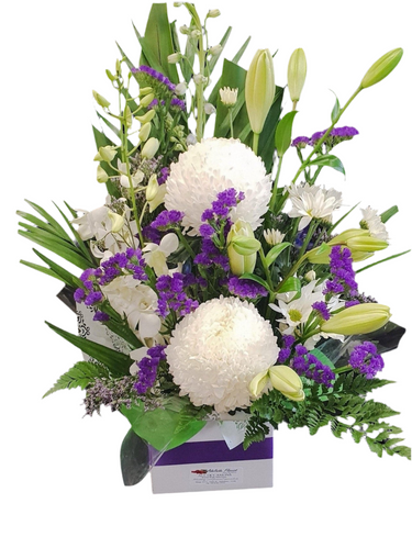 This Beautiful arrangement is designed in a box featuring Mums, Asiatic Lilies, Singapore Orchids, Statice, Chrysantheums and a variety of foliage including Leather Fern, Golden Cane and Gymea.