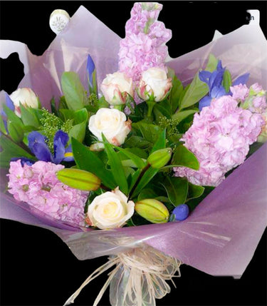 This stunning bouquet really celebrates spring as it features, Stocks, Iris's, Roses, Asiatic Lilies and a variety of Foliage and Filler Flowers. This beautiful bouquet is perfect for any spring, or even non-spring, related occasions.