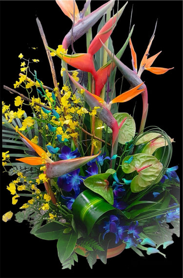This amazing design is designed in a Hat Box featuring Birds of Paradise, Anthurium, Singapore Orchids, Filler Flower and a variety of foliage. This arrangement is perfect for all occasions.