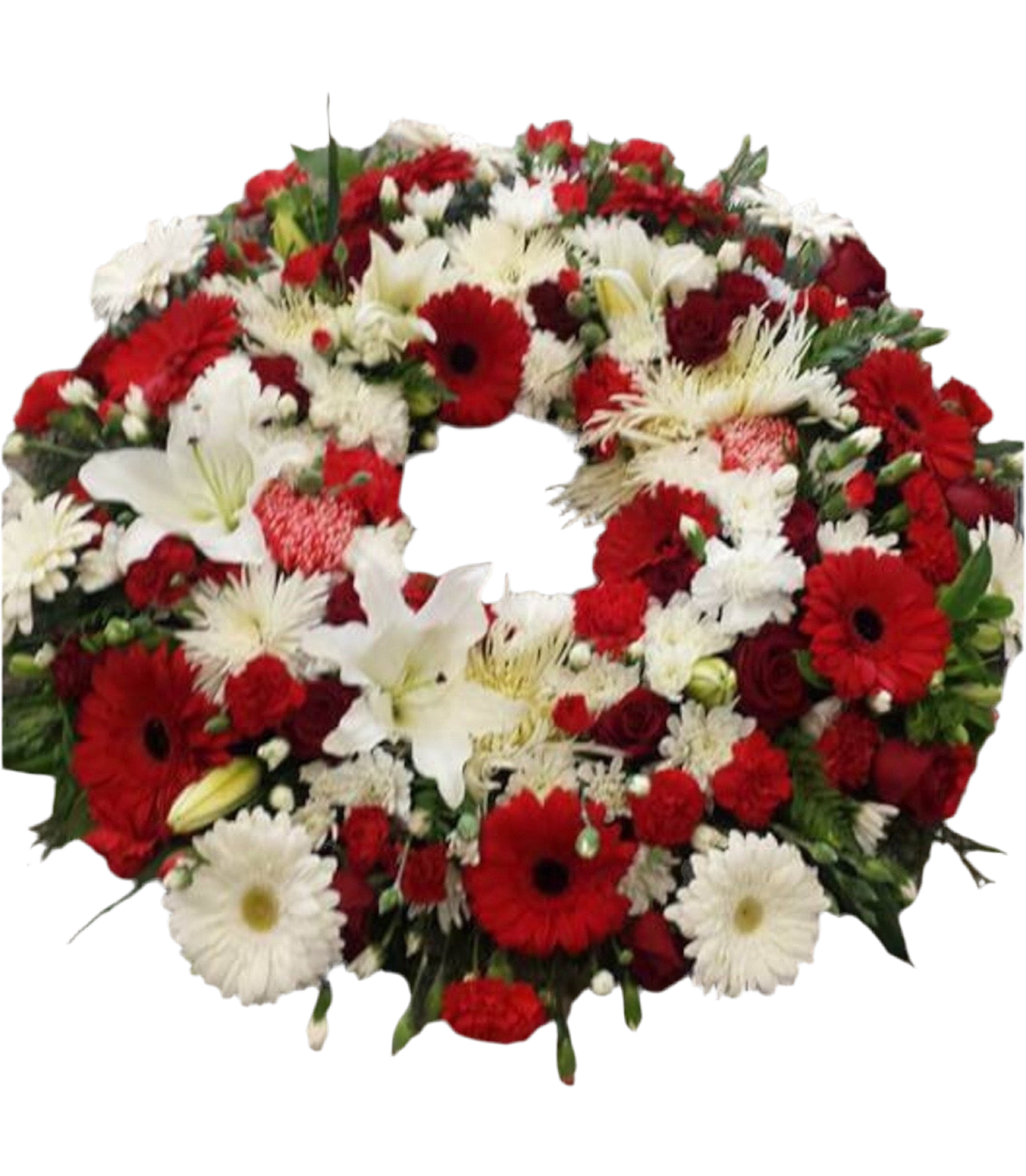 This Elegant red and white round wreath is a perfect sentiment for the loss of loved ones and makes an appropriate funeral arrangement. It is designed with Gerberas, Lilies, Chrysanthemums with a variety of foliage.