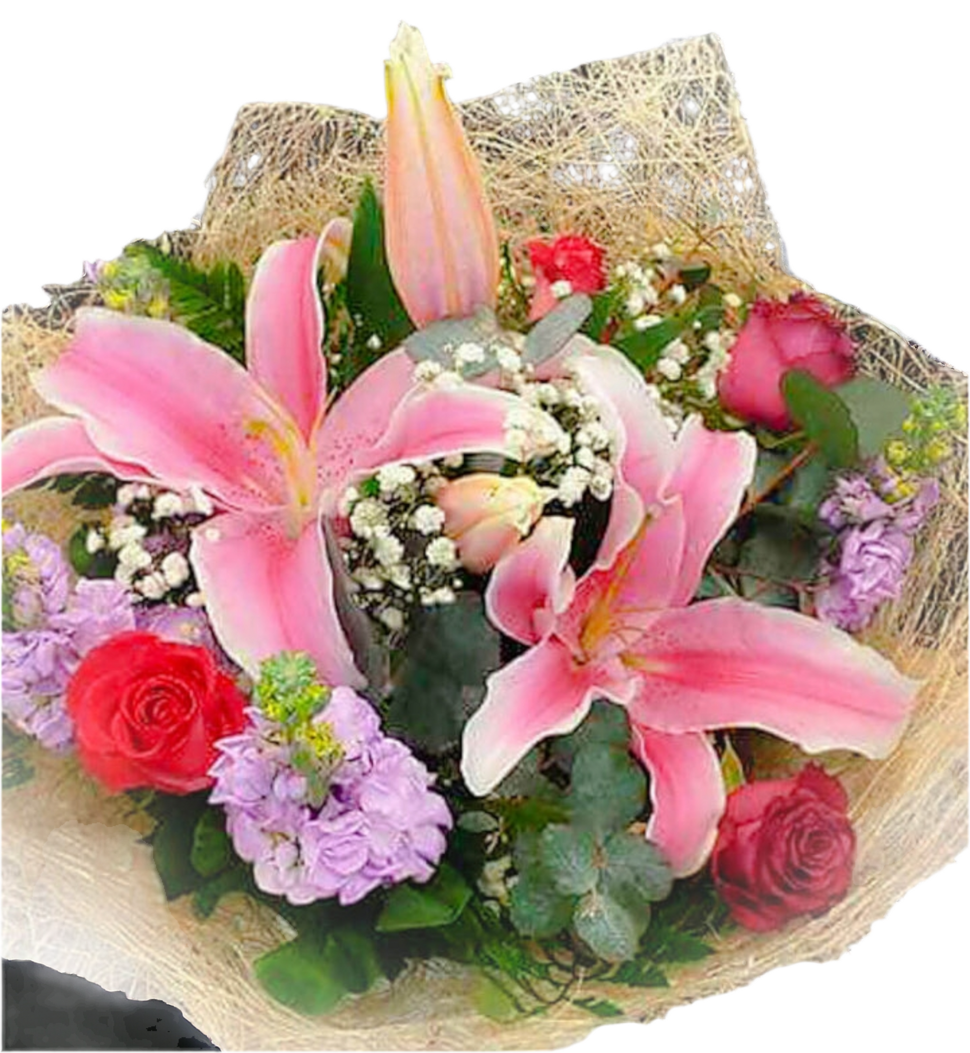 This Angelic Bouquet designed with oriental lilies, stocks, roses, gypsophlia and a variety of foliage including blue gum and leather fern. This bouquet is an angel of a gift and is perfect for all occasions.