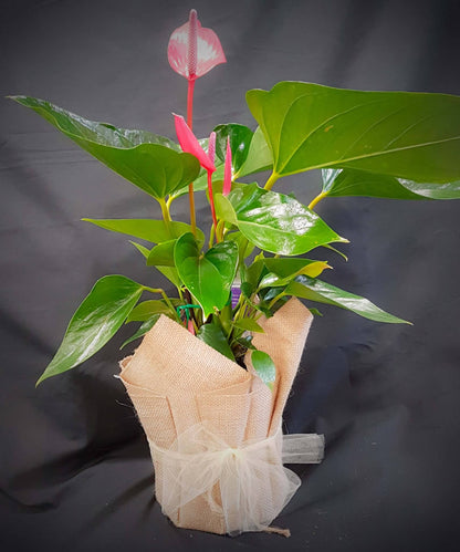 Medium Anthurium Plant is potted in a Jute Bag