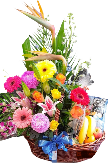 This Magnificent Basket Hamper is designed in a basket with a floral arrangement featuring beautiful bright flowers including Birds of Paradise, Delphiniums, Gerberas, Roses, oriental lilies, Mums, Singapore orchids and a variety of greenery including gymea, golden cane. It also includes a selection of savoury snacks such as nuts, dips, cheese, chocolates and fresh fruit. A perfect gift to brighten someone's day and suitable for all occasions.