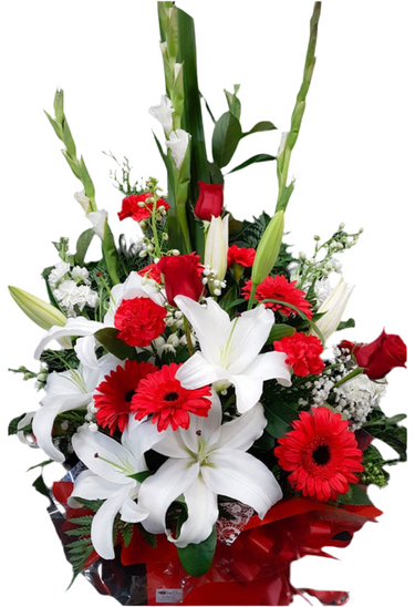 This bold red and white arrangement is designed in a box featuring Gladiolus, Gerberas, Lilies, Carnations, Roses, Gypsophlia and a variety of greenery including Leather Fern. This is perfect for a bold statement and makes a perfect gift for all occasions especially Christmas.