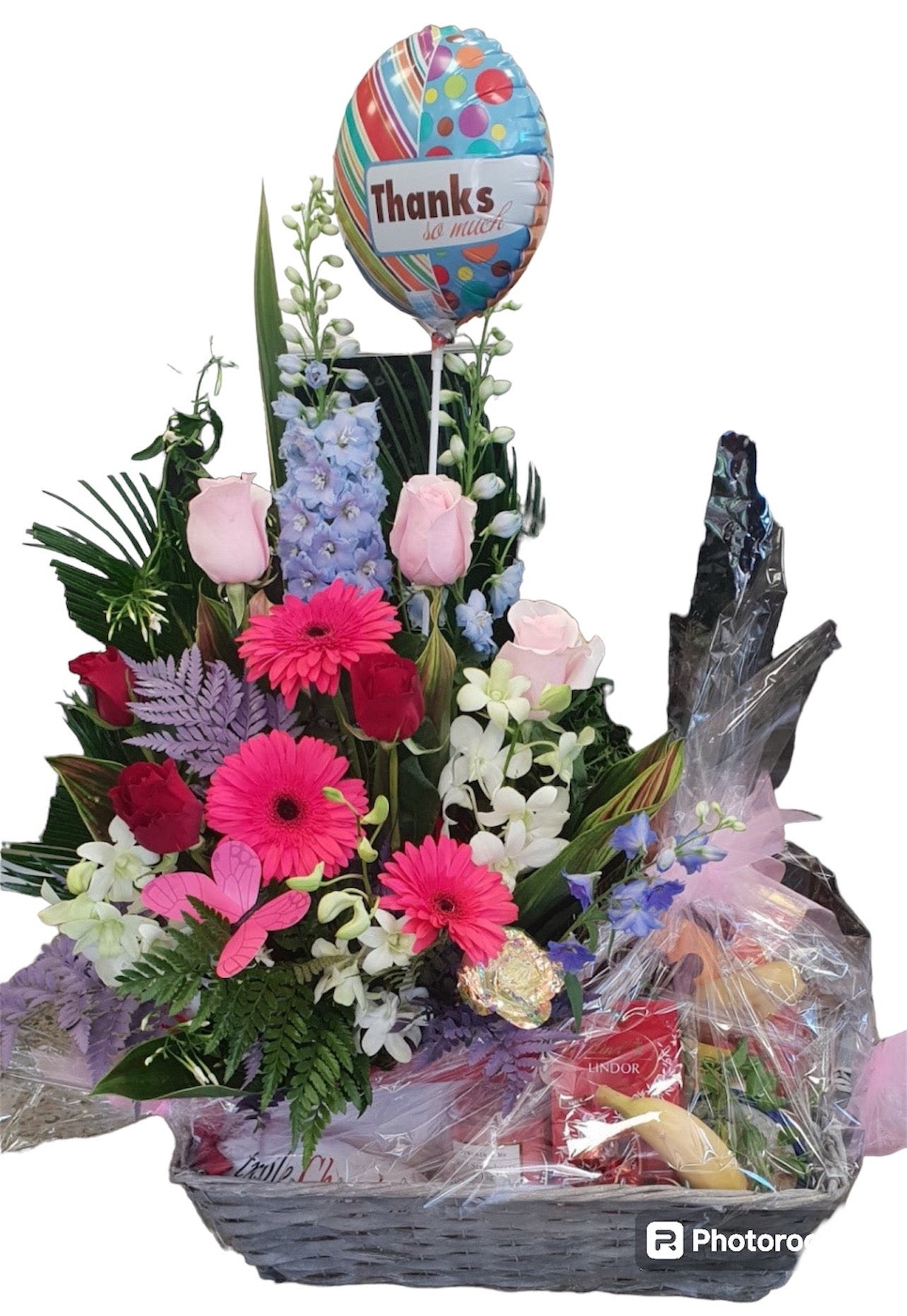 Gourmet gift basket is an amazing gift for any special occasion. It is designed in a basket featuring a fresh flower arrangement of any colour and design and also an array of fresh fruit, nuts, chocolates, dips and cheeses. (balloon is not included, extra add on cost)