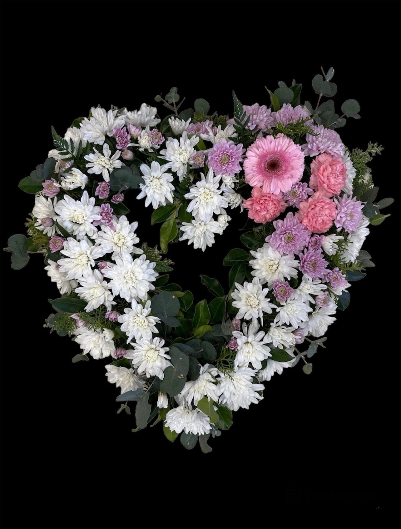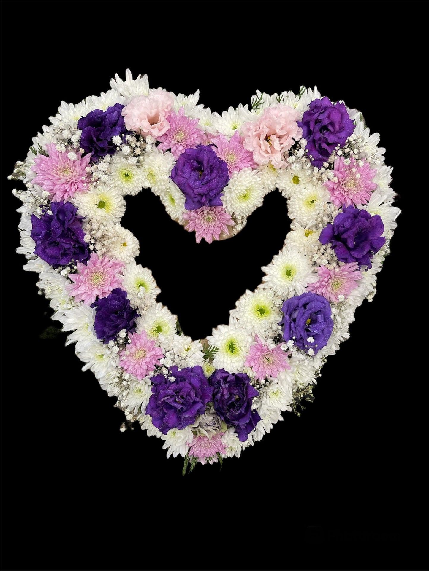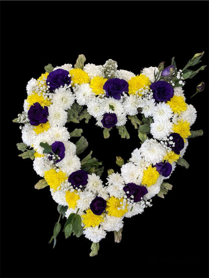This Beautiful Heart Wreath is the perfect sentiment to remember the loss of a loved one. Making it the perfect funeral arrangement. These designs features Chrysanthemums, Lisianthus, Gypsophila and foliage. Flower colour combinations can be changed but they have to be requested.