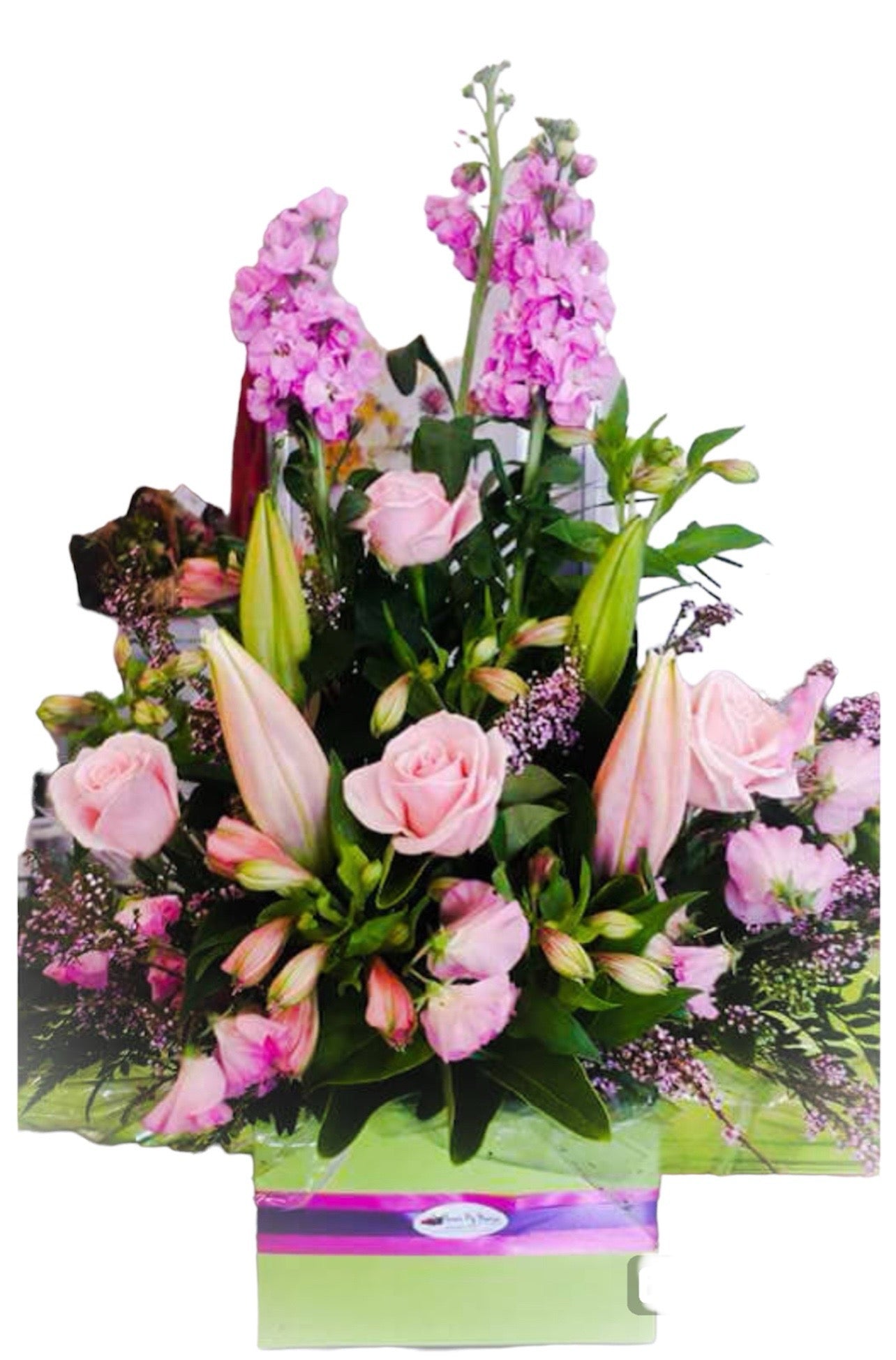 This perfectly pink design is arranged in a box featuring Stocks, Roses, Oriental Lilies, Alstroemeria, Filler Flowers and a variety of foliage. This arrangement is perfect for all occasions that need a splash of pink.