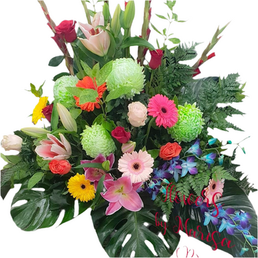 This Gorgeous Design is arranged in a ceramic vase featuring Disbud Mums, Asiatic Lilies, Roses, Gladioli, Singapore Orchids, Gerberas and a variety of Foliage including Leather Fern and Monstera Leaves. These flowers can be requested in an array of colours making this arrangement perfect for every and all occasions and needs.