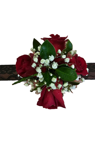 This Gorgeous Corsage is the perfect accessory to match your formal dress featuring 4 Red roses with greenery and baby's breath with a black lace ribbon band.