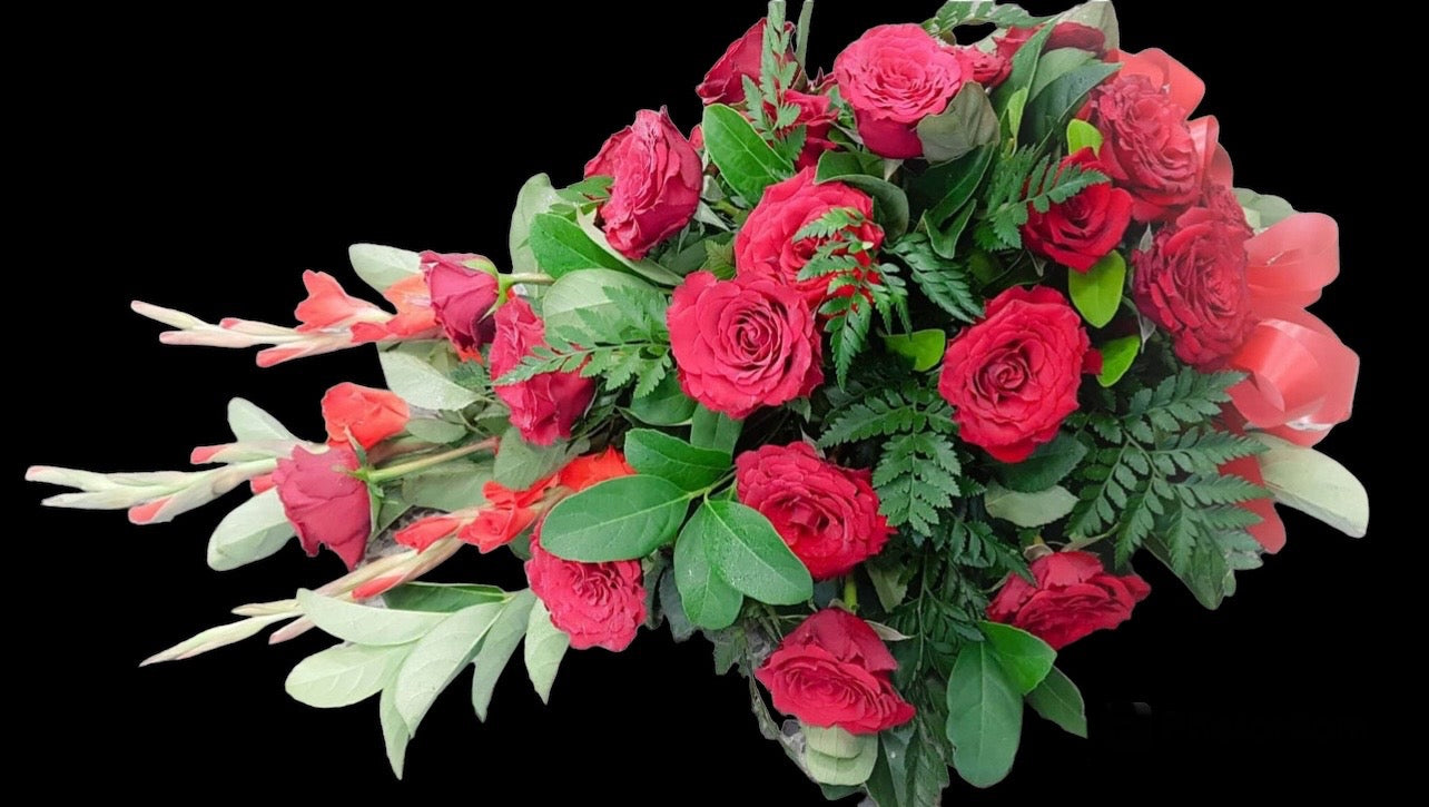 This Stunning ingle ended rose spray is a beautiful sentiment for the loss of a loved one which is perfect for a funeral. This design is arranged featuring Gladioli, Roses and a variety of greenery including Leather Fern.