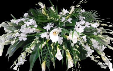This Absolutely stunning casket spray is the perfect sentiment for the loss of a loved one in your life making this the perfect funeral arrangement. This design features Arum Lilies, Singapore Orchids and a variety of complimenting Foliage.